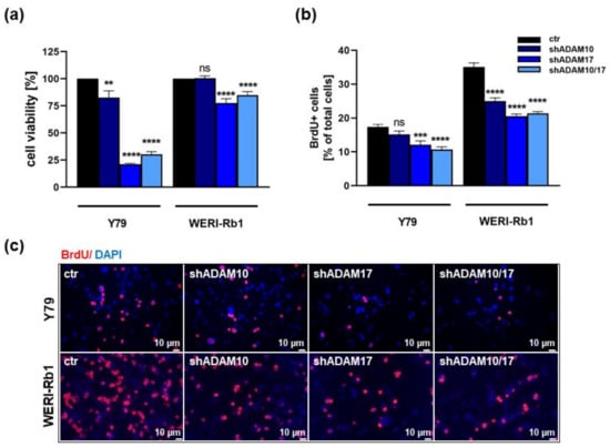 Effects of ADAM10/17 single and double knockdown on cell viability and proliferation of RB cells. Stable ADAM10 (shADAM10), ADAM17 (shADAM17) and ADAM10/17 (shADAM10/17) knockdown decreases cell viability and proliferation levels of Y79 and WERI-Rb1 cells compared to control cells (ctr) as revealed by WST-1 assays (a), and BrdU stains (b,c). Values are means of three independent experiments ± SEM. ns p > 0.05; ** p < 0.01; *** p < 0.001 and **** p < 0.0001 statistical differences compared to the control (ctr) group calculated by Student’s t-test.