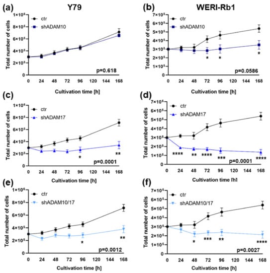 In both RB cell lines investigated, additional growth curve analyses (Figure 4a–f) after ADAM10 and ADAM17 single or ADAM10/17 double knockdown mainly confirmed the effects on cell proliferation shown above. Changes in overall cell growth did not reach significance after ADAM10 single knockdown (Figure 4a,b) being, however, highly significant after ADAM17 knockdown (p = 0.0001; Figure 4c,d) and to a lesser extend also following ADAM10/17 double knockdown (p = 0.0012 and p = 0.0027; Figure 4e,f). In accordance with the BrdU results, changes in overall cell growth after ADAM10 knockdown could only be shown in WERI-Rb1 cells, whereas ADAM17 knockdown induced significant effects in both RB cell lines investigated.