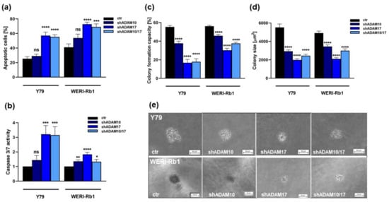Effects of ADAM10/17 single and double knockdown on apoptosis and anchorage independent growth of RB cell lines. Stable ADAM10 (shADAM10), ADAM17 (shADAM17) and ADAM10/17 (shADAM10/17) knockdown increases caspase mediated apoptosis levels of Y79 and WERI-Rb1 cells compared to control cells (ctr) as revealed by DAPI cell counts (a) and caspase3/7 assays (b). Both RB cell lines show significantly reduced colony formation capacity (c) and colony sizes (d,e) after ADAM10 and ADAM 17 single or double knockdown as revealed by soft agarose assays. Values are means of three independent experiments ± SEM. ns > 0.05; * p < 0.05; ** p < 0.01; *** p < 0.001 and **** p < 0.0001 statistical differences compared to the control (ctr) group calculated by Student’s t-test.