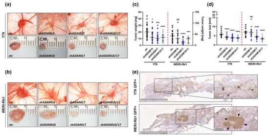 Effect of lentiviral ADAM10/17 single and double knockdown on tumor formation of RB cell lines in vivo as revealed by chick chorioallantoic membrane (CAM) assays. Photographs of CAM tumors in situ (upper row) and ruler measurements (in cm) of excised CAM tumors (lower row) 7 days after inoculating the Y79 (a) and WERI-Rb1 (b) RB cell onto the CAM. Quantification of weight (c) and size (d) of CAM tumors developing from ADAM10 (shADAM10), ADAM17 (shADAM17) and ADAM10/17 (shADAM10/17) depleted Y79 and WERI-Rb1 cell lines in comparison the control cells (ctr). Values are means of at least three independent experiments ± SEM. ns p > 0.05; * p < 0.05; *** p < 0.001; and **** p < 0.0001 statistical differences compared to the control group calculated by Student’s t-test. (e) GFP antibody staining of stably GFP expressing Y79 and WERI-Rb1 cells in CAM tumor paraffin sections. Immunohistochemistry was revealed using diaminobenzidine (brown signal) and hematoxylin counterstaining (blue nuclei staining). Scale bars, 2 mm and 300 µM (magnified insets). #: blood vessel in CAM mesoderm, *: GFP-positive (GFP+) RB tumor cells, arrowheads: solid GFP-positive RB tumor mass.