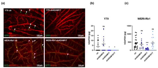 Furthermore, we noticed differences in blood vessel density around the CAM tumors developing upon inoculation of control or ADAM-depleted RB cells. CAM tumors developing from ADAM10 and ADAM17 depleted RB cells seemed to have reduced blood vessel density compared to control cells. In accordance with our observations, it could be shown that retinal blood vessels in ADAM17 hypomorphic mice require ADAM17 activity in angiogenesis [], whereas ADAM10 inhibition induced vascular sprouting and density in vivo. However, further analyses regarding the involvement of ADAM10 and ADAM17 in blood vessel sprouting in RB tumor development are needed to address the question properly.