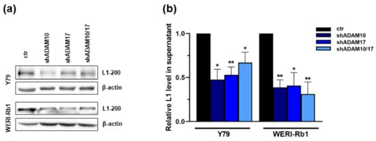 The soluble ectodomain of L1CAM, a known ADAM target, is believed to stimulate cell survival, protect cells from apoptosis, and mediate cell migration [,,,], effects likewise effected by ADAM10 and ADAM17 knockdown. A previous study by our group revealed that L1CAM depletion in RB cells reduces cell viability and cell growth and concomitantly induces apoptosis []. As in other cancer cells, ectodomain shedding of L1CAM is mediated by ADAM10 and ADAM17 [,], we investigated the expression of the soluble L1CAM ectodomain in cell culture supernatant after ADAM10/17 single and double knockdown. Expression levels of the soluble L1CAM ectodomain were significantly reduced in WERI-Rb1 and Y79 RB cell culture supernatant after ADAM10/17 single and double knockdown, with a median reduction of up to 50% (Figure 8a,b). These data show that also in RB cell lines, the soluble L1CAM ectodomain is released by ADAM10 and ADAM17 shedding, and thus, L1CAM could be one of the downstream effectors after ADAM10 or ADAM17 knockdown.