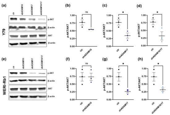 AKT and phospho-AKT (pAKT) expression levels after shRNA-mediated ADAM10/17 single (shADAM10 and shADAM17) or double knockdown (shADAM10/17) in the RB cell lines Y79 and WERI-Rb1 as revealed by western blot analysis. Representative western blots showing AKT and p-AKT expression levels (a,e) and quantification of the p-AKT/AKT ratio (b–d,f–h) after ADAM10/17 single and double knockdown in the RB cell lines Y79 and WERI-Rb1. Indicated intensity ratios relative to ß-actin, used as a loading control, were calculated using MICRO MANAGER 1.4 software. Values are means of three independent experiments ± SEM. ns p > 0.05 and * p < 0.05 statistical differences compared to the control group calculated by paired Student’s t-test.