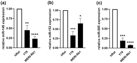 MiRNA-145, miRNA-152 and miRNA-365 expression levels in parental WERI-Rb1 and Y79 cell lines as revealed by real-time PCR (a–c). Values are means of at least three independent experiments ± SEM. * p < 0.05; ** p < 0.01; *** p < 0.001; and **** p < 0.0001 statistical differences compared to the control group calculated by Student’s t-test.