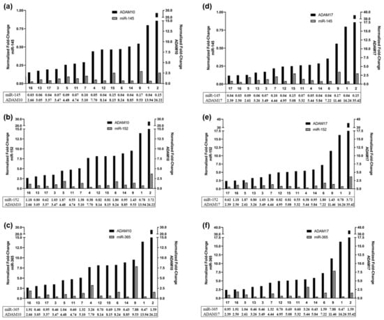 In order to reveal if the expression of these miRs also negatively correlates with ADAM10 and ADAM17 expression patterns in primary RBs, 15 RB patients’ tumor samples were analyzed. Real-time PCR analysis revealed upregulated ADAM10 (Figure 11a–c) and ADAM17 (Figure 11d–f) expression with simultaneously reduced miR-145 expression levels (Figure 11a,d) for all 15 RB patients. Expression levels of miR-152 (Figure 11b,e) and miR-365 (Figure 11c,f) were patient dependent and partially correlated with ADAM expression. These correlation patterns suggest that at least miR-145 is a potential regulator of ADAM10 and ADAM17 in retinoblastoma.