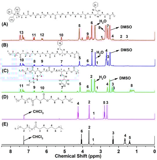 1H NMR spectra of mitochondria-targeting polymer TPP-PEG2k-b-(BS-AA)13 P1 (A), ROS/pH dual responsive polymer mPEG2k-b-(BS-AA)14 P2 (B), pH-responsive polymer mPEG2k-b-(AH-AA)10 P3 (C), ROS-responsive polymer mPEG2k-b-(SA-TG)25 P4 (D), and control polymer mPEG2k-b-PCL5k P5 (E).