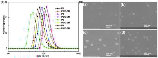 The size and size distribution of blank and GEM-loaded polymeric micelles was studied by DLS, and the results are presented in Figure 2A. The size and polydispersity index (PDI) of blank P1, P2, P3, and P4 micelles were 87.71 nm (PDI = 0.112), 97.9 nm (PDI = 0.150), 54.8 nm (PDI = 0.194), and 78.91 nm (PDI = 0.168), respectively. The size and PDI of GEM-loaded P1, P2, P3, and P4 micelles were 133.5 nm (PDI = 0.041), 136.1 nm (PDI = 0.219), 92.6 nm (PDI = 0.101), and 121.2 nm (PDI = 0.142), respectively. The size of GEM-loaded micelles increased significantly compared to the corresponding blank micelles. SEM was further employed to observe the size and morphology of blank and GEM-loaded P1 and P2 micelles. Both blank and GEM-loaded micelles were spherical nanoparticles (Figure 2B). Compared to the results of DLS, the size observed by SEM was similar or smaller. Since the nanoparticles observed by SEM were dry and dehydrated, the drying process may lead to the shrinking of micelles [].