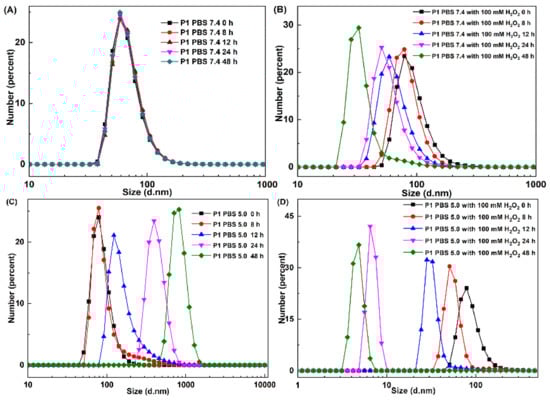 Size changes of TPP-PEG2k-b-(BS-AA)13 P1 micelle incubated with PBS 7.4 (A), PBS 7.4 with 100 mM H2O2 (B), PBS 5.0 (C), and PBS 5.0 with 100 mM H2O2 (D) for different times.