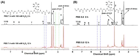 For 1H NMR study: 1H NMR spectra were applied to characterize the ROS/pH-responsiveness of the polymer by investigating the structural changes of the polymer after the treatment of H2O2 or acid PBS solution. In total, 100 mM H2O2 solution were obtained by adding 0.1 mL H2O2 (30%) to 9.9 mL of PBS (pH 7.4). Polymeric micelle solution (5 mg/mL, 4 mL) was mixed with H2O2 (100 mM, 4 mL) or acid PBS solution (pH 5.0, 4 mL) by vortex. The solution was then incubated at 37 °C for 24 h. The solution was lyophilized and characterized by 1H NMR.
