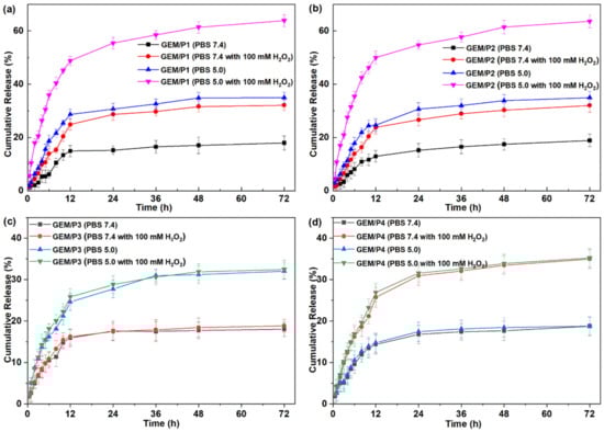 Drug release profiles of GEM/P1 micelle (a), GEM/P2 micelle (b), GEM/P3 micelle (c), and GEM/P4 micelles (d) treated with neutral PBS (pH 7.4), acid PBS (pH 5.0), neutral PBS (7.4) with 100 mM H2O2, and acid PBS (5.0) with 100 mM H2O2.