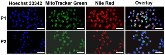 A confocal laser scanning fluorescence microscope was applied to observe the mitochondria-targeting properties of the drug-loaded P1 micelles in Skov3 cells. NR, a model drug with strong red fluorescence, instead of gemcitabine, was used to prepare NR-loaded micelles to study the mitochondrial localization properties of drug-loaded P1 micelles []. The nuclei and mitochondria of Skov3 cells were sequentially labeled with blue fluorescent Hoechst 33,342 and green fluorescent Mito-Tracker Green FM []. Yellow fluorescence was observed in the mitochondria in the overlay images of cells treated with NR/P1 micelles (Figure 6), meaning that NR/P1 micelles entered the mitochondria. The green mitochondria fluorescence and the red Nile Red fluorescence were superimposed to form yellow fluorescence. However, yellow fluorescence did not appear in the mitochondria in the overlay images of cells incubated with P2 micelles for 4 h (Figure 6). P2 micelles without TPP groups cannot target and locate in mitochondrial. These results suggest conjugating TPP on the surface of nanoparticles could lead to effective lysosome escape and mitochondrial localization. After the nanoparticles were internalized and transported to the lysosome, a small fraction of the nanoparticles showed pH-responsive degradation and released hydrophobic gemcitabine, which was subsequently protonated. Protonated gemcitabine with cationic TPP synergistically induces a proton sponge effect and facilitates the successful escape of the remaining nanoparticles from the lysosome, targeting the mitochondria by electrostatic interaction [,,].