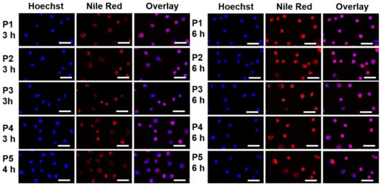 CLSM images of Skov3 cells treated with NR-loaded P1, P2, P3, P4, and P5 micelles at different times, and the cell nucleus was stained with Hoechst 33342. The scale bar is 50 µm.