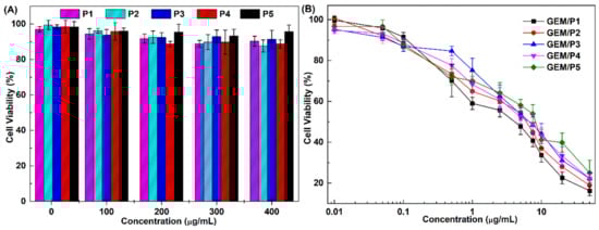 Biocompatibility of polymer P1, P2, P3, P4, and P5 micelles was evaluated by an MTT assay in Skov3 cells. The survival rate of Skov3 cells was higher than 90% after incubation for 48 h, even at a high micelle concentration of 400 µg/mL (Figure 8A). These results indicate that all polymer micelles were biocompatible.