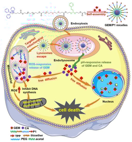 Gemcitabine is the first-line anticancer drug of many cancers; it clinically kills cancer cells by inhibiting DNA synthesis and cell growth activity [,]. Owing to a lack of nucleotide excision repair, mitochondrial DNA is more susceptible to damage than nuclear DNA and inhibiting the synthesis of mitochondrial DNA can lead to mitochondrial dysfunction and induce cancer cell death [,]. Cinnamaldehyde (CA) has an α,β-unsaturated Michael acceptor pharmacophore and exhibits potent antitumor activity by stimulating mitochondria to produce ROS and inducing oxidative stress []. The characteristics of low solubility and easy oxidation greatly limit the antitumor application of cinnamaldehyde. Constructing a pH or ROS-responsive nano-drug delivery system based on cinnamaldehyde and releasing cinnamaldehyde in the response to degradation is an effective method to improve the antitumor effect of cinnamaldehyde [,,]. Ge et al. constructed cancer cell and mitochondrial dual-targeting nanoparticles, which exhibited good anticancer efficacy to multidrug resistance cancer cells by releasing CA toward acidic lysosomes to induce the oxidative stress of mitochondria and then accelerate the drug release rate of mitochondria-targeting nanoparticles by ROS response degradation [].