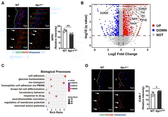 In Npr1+/− mice, a decreased NPR1 expression in the aorta, especially in the endothelium, was confirmed by immunofluorescent staining (Figure 1A). We next performed RNA-sequencing analysis for the aorta of Npr1+/− and wild type (WT) mice. A total of 2184 DEGs (|log2 fold change| ≥ 0.5, q value < 0.05) was found (Figure 1B). Gene Ontology (GO) biological process annotation showed that these DEGs were highly related to cell adhesion among the top 10 signaling pathways (Figure 1C). Supportively, immunofluorescent staining showed an increased expression of ICAM-1 (an adhesion marker) in the aortic endothelium of Npr1+/− mice compared with that of WT (Figure 1D), suggesting that NPR1 may be associated with endothelial cell adhesion.