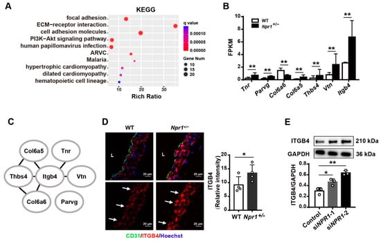 Identification of Itgb4 in the aorta of Npr1+/- mice and in NPR1-knockdown HUVECs. (A) KEGG enrichment of genes related to cell adhesion. ARVC: arrhythmogenic right ventricular cardiomyopathy. Y-axis represents pathways and X-axis represents the rich ratio. The intensity of color and bubble size indicate the q value and gene number, respectively. (B) mRNA expression of focal adhesion-related genes in the aorta of Npr1+/- and WT mice. (C) A gene interaction network for targeted genes related to focal adhesion in the aorta of Npr1+/- mice. (D) Immunofluorescent staining for ITGB4 (red), endothelium (green), and nuclei (blue) in the aorta of Npr1+/- and WT mice. n = 4. Scale bar: 20 µm. L: Lumen. Arrows indicate the endothelium. Relative ITGB4 levels were evaluated based on the mean fluorescent intensity. (E) Western blot analysis for ITGB4 expression in NPR1-knockdown HUVECs. Data are mean ± S.D. * p < 0.05, ** p < 0.01 vs. WT or control.