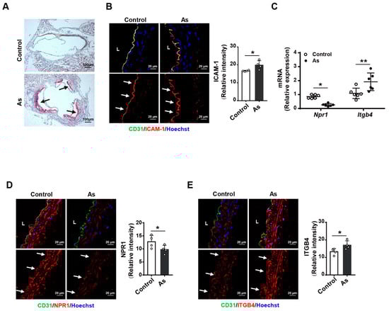 NPR1 and ITGB4 expression in the aorta from a mouse model of atherosclerosis (As). (A) Oil red O staining of mouse aortic root in the As model. Scale bar: 100 µm. (B) Immunofluorescent staining for ICAM-1 (red), endothelium (green), and nuclei (blue) in aorta frozen sections from the mouse model of As. n = 4. Scale bar: 20 µm. L: Lumen. Arrows indicate the endothelium. Relative expression levels were calculated according to the mean fluorescent intensity. (C) qPCR for Npr1 and Itgb4 mRNA expression in mouse aorta from the As model. (D, E) Immunofluorescent staining for NPR1 (red), ITGB4 (red), endothelium (green), and nuclei (blue) in aorta frozen sections from the mouse model of As. n = 4. Scale bar: 20 µm. L: Lumen. Arrows indicate the endothelium. Relative expression levels were calculated according to the mean fluorescent intensity. Data are mean ± S.D. * p < 0.05, ** p < 0.01 vs. WT.