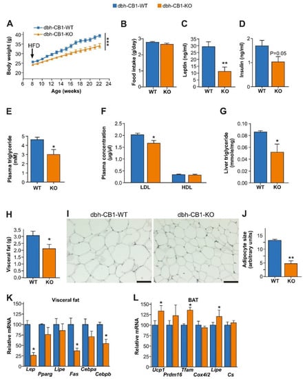 2.2. dbh-CB1-KO Mice Show Reduced Weight, Adiposity, and Increased BAT Thermogenesis on a High-Fat Diet