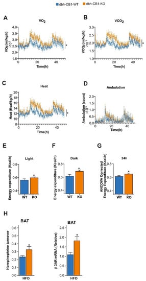 2.3. dbh-CB1-KO Mice on a High-Fat Diet Show Increased Energy Expenditure and SNS Tone