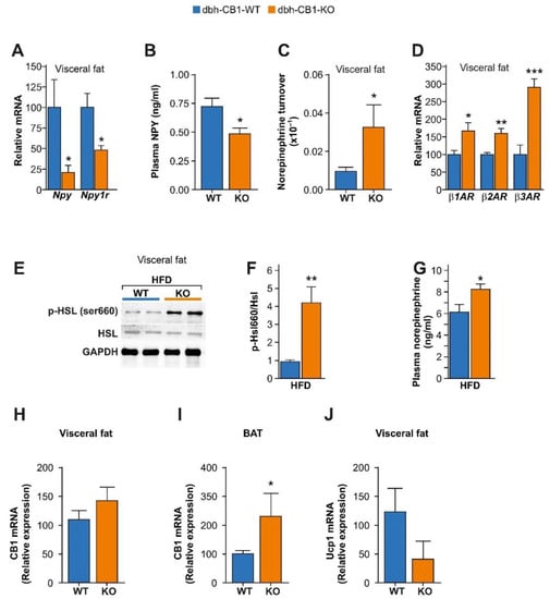2.4. Lack of CB1 in dbh-Positive Neurons Enhances SNS Activity While Decreases NPY Activity in the Visceral Fat under Obesogenic Conditions