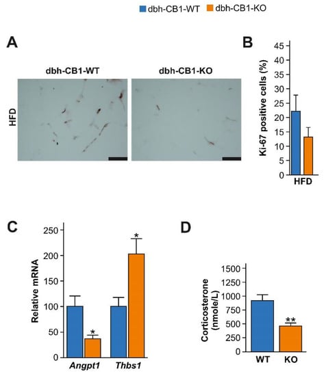 2.5. HFD-Fed dbh-CB1-KO Mice Showed Reduced Proliferation and Angiogenesis in the Visceral Fat and Decreased HPA Axis Activity