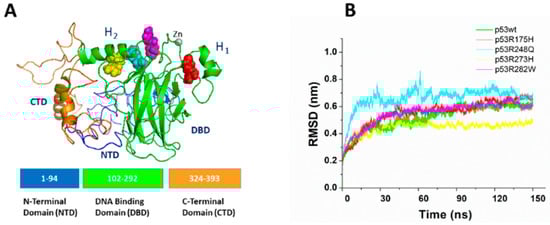 (A) Graphical representation of the best model for p53wt monomer. The residues submitted to a punctual mutation are represented as colored spheres: p53R175H (red), p53R248Q (cyan), p53R273H (yellow), and p53R282W (magenta). The Zn ion is represented as a light grey sphere. The various p53 domains are marked in different colors. (B) Temporal evolution of the RMSDs for all the p53 systems.