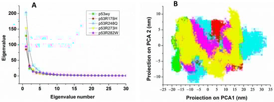 To find out the relevant collective modes of wild-type and mutated p53 molecules, the MD trajectories have been investigated by the ED method. Indeed, ED allows us to extract concerted fluctuations with large amplitudes from MD simulations, through PCA. In particular, collective modes can be described by the eigenvectors derived from the covariance matrix of atomic fluctuations, with the most relevant modes corresponding to the highest eigenvalues. The first 30 eigenvalues, ranked in a decremental order, are shown in Figure 3A. In all the cases, the eigenvalues rapidly decrease down to a very low value (less than 5% of the maximum) within the first ten eigenvalues. Similar results have been obtained for other runs. Such a trend, commonly observed in the eigenvalues of protein modes, indicates that the most relevant motions are concentrated in a few modes whose dimensionality is represented by the number of eigenvalues accounting for the first ranked values.