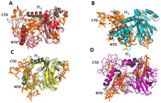 As described in Section 3.2, each system has been submitted to a preliminary run to allow for a relaxation of the structures. Successively, 150 ns long runs have been carried out. Figure 1B shows the representative temporal evolution curves of all the atoms of RMSD, during the last 150 ns long MD trajectories. In all the cases, we note a rather rapid increase within the first 5 ns, followed by a slower increase which is practically completed within the first 50 ns. Then, the RMSDs oscillate around a plateau, consistently with the establishment of a stable state. The observed trend is qualitatively similar to that usually detected in the RMSD of other proteins, although the time required to reach a plateau is generally longer.