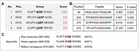The prediction and conservation of SUMOylation sites in myocardin. (A,B) The putative SUMOylation sites in myocardin isoform B (Mus musculus) were predicted by the SUMOplotTM Analysis Program online tool (https://www.abcepta.com/sumoplot, accessed on 18 February 2022) (A) and SUMOsp2.0 software (B). One lysine residue (lysine 573) was consistent in the results. (C) Alignment of orthologous myocardin amino acid sequences in Mus musculus, Homo sapiens, and Rattus norvegicus indicates evolutionary conservation of SUMOylation sites in myocardin. (A–C), The canonical SUMO-binding motif is defined as ψKX(D/E), where ψ represents an aliphatic or hydrophobic amino acid residue, ‘K’ in the consensus sequence is the SUMO acceptor lysine, and ‘X’ is any amino acid, which is adjacent to an acidic residue (Asp/Glu).