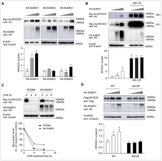 SUMO-1 promotes the protein stability of myocardin. (A) HEK-293T cells were transfected with Myc-his-myocardin (Myc-his-MYOCD) and increasing amounts of HA-SUMO1, HA-SUMO2, or HA-SUMO3 for 24 h. The levels of Myc-his-MYOCD in whole-cell lysates were determined by Western blotting with anti-his, anti-HA, and anti-β-actin antibodies (n = 3, * p < 0.05). (B) HEK-293T cells were transfected with Myc-his-MYOCD and increasing amounts of HA-SUMO1 for 24 h, in the presence or absence of MG132 (10 μM) for the last 10 h. Lysates were prepared and analyzed by Western blotting (n = 3, * p < 0.05). SE, short-time exposure; LE, long-time exposure. (C) HEK-293T cells were transfected with Myc-his-MYOCD and PCDNA or HA-SUMO1 for 24 h and were subsequently exposed to the protein synthesis inhibitor cycloheximide (CHX) for the indicated time. Lysates were prepared and analyzed by Western blotting. The relative level of Myc-his-MYOCD was evaluated by densitometry and normalized to β-actin. (D) HEK-293T cells were transfected with Flag-myocardin/WT (Flag-MYOCD/WT) or Flag-myocardin/K573R (Flag-MYOCD/ K573R) and increasing amounts of HA-SUMO1 for 24 h. The levels of Flag-MYOCD in whole-cell lysates were determined by Western blotting with anti-Flag, anti-HA, and anti-α-tubulin antibodies (n = 3, * p < 0.05).