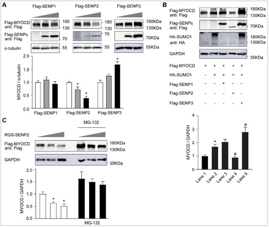 SENP2 promotes proteasome-dependent degradation of myocardin. (A) HEK-293T cells were transfected with Flag-myocardin (Flag-MYOCD) and increasing amounts of Flag-SENP1, Flag-SENP2, or Flag-SENP3 for 24 h. The levels of Flag-MYOCD in whole-cell lysates were determined by Western blotting with anti-Flag and anti-α-tubulin antibodies (n = 3, * p < 0.05). (B) HEK-293T cells were transfected with Flag-MYOCD, HA-SUMO1, and Flag-SENP1, Flag-SENP2, or Flag-SENP3 for 24 h. Lysates were prepared and analyzed by Western blotting (n = 3, * p < 0.05 vs. Lane 1, # p < 0.05 vs. Lane 2). (C) HEK-293T cells were transfected with Flag-MYOCD and increasing amounts of RGS-SENP2 for 24 h, in the presence or absence of MG132 (10 μM) for the last 10 h. Lysates were prepared and analyzed by Western blotting (n = 3, * p < 0.05).