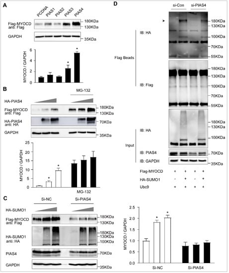 PIAS4 is the SUMO E3 ligase that mediates myocardin SUMOylation. (A) HEK-293T cells were transfected with Flag-MYOCD and HA-PIAS1, HA-PIAS2, HA-PIAS3, or HA-PIAS4 for 24 h. Lysates were prepared and analyzed by Western blotting (n = 3, * p < 0.05). (B) HEK-293T cells were transfected with Flag-MYOCD and increasing amounts of HA-PIAS4 for 24 h, in the presence or absence of MG132 (10 μM) for the last 10 h. Lysates were prepared and analyzed by Western blotting. (C) HEK-293T cells were transfected with control siRNA (si-NC) and PIAS4 siRNA (si-PIAS4) for 48 h and then transfected with increasing amounts of HA-SUMO1 for another 24 h. Lysates were prepared and analyzed by Western blotting (n = 3, * p < 0.05). (D) HEK-293T cells were transfected with control siRNA (si-NC) and PIAS4 siRNA (si-PIAS4) for 48 h and then transfected with or without HA-SUMO1 for another 24 h. The SUMOylation of Flag-MYOCD was determined by the IP assay using Flag beads and Western blotting using anti-Flag, anti-HA, anti-PIAS4, and anti-GAPDH antibodies (n = 3, * p < 0.05).