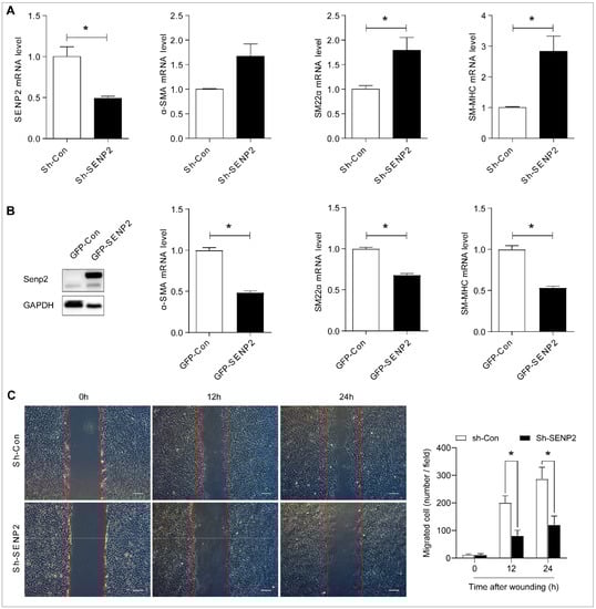 SENP2 promotes VSMC phenotypic switching in vitro. (A) VSMCs were infected with control lentivirus (Sh-Con) and sh-SENP2 lentivirus (Sh-SENP2) for 72 h. The expression of SENP2, α-SMA, SM22α, and SM-MHC was examined by real-time quantitative PCR (RT-qPCR). (B) VSMCs were infected with adenovirus containing GFP-Con or GFP-SENP2 for 48 h. The expression of SENP2 was examined by Western blotting. The expression of α-SMA, SM22α, and SM-MHC was examined by RT-qPCR. (C) VSMCs were infected with control lentivirus (Sh-Con) and sh-SENP2 lentivirus (Sh-SENP2) for 48 h. Monolayer confluent cells were serum-starved overnight and scraped in the presence of normal growth medium to stimulate VSMC migration toward the wound area. Representative images of the in vitro scratch-wound assay and quantification of migrated cells are presented. Scale bars: 200 µm. (A–C), n = 3, * p < 0.05.