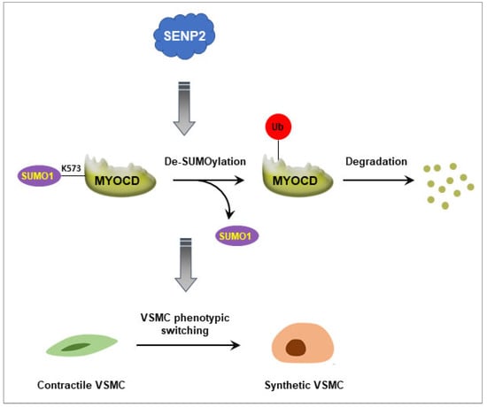 In the present study, we examined the SUMO modification of myocardin and demonstrated that myocardin is modified by SUMO-1 at lysine 573, which can be reversibly de-conjugated by SENP2. SUMOylation promotes myocardin stability, whereas SENP2 facilitates its proteasome-dependent degradation and induces VSMC phenotypic switching. These findings suggest that SENP2 is an important regulator of VSMC phenotype via myocardin de-SUMOylation.