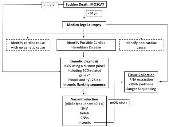 - Grassi, S.; Campuzano, O.; Coll, M.; Cazzato, F.; Sarquella-Brugada, G.; Rossi, R.; Arena, V.; Brugada, J.; Brugada, R.; Oliva, A. Molecular Sciences Update on the Diagnostic Pitfalls of Autopsy and Post-Mortem Genetic Testing in Cardiomyopathies. Int. J. Mol. Sci. 2021, 22, 4124. [Google Scholar] [CrossRef] [PubMed]