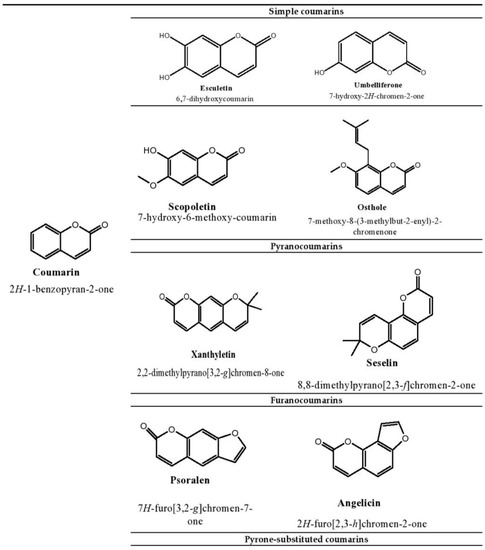 The plant kingdom is the richest source of naturally occurring phenolic compounds, as there are about 8000 phenolic compounds in its distribution [1]. The presence of these phenolic compounds in nature has been extensively used by researchers to tackle disease stratification. Coumarins are one of the main bioactive phenolic or heterocyclic compounds with their large distribution in nature. These compounds belong to the benzopyrone class and are found in various plants, notably in the seeds of the tonka bean and Dipteryx odorota. These phenolic compounds are classified into four types, namely, simple coumarins, furanocoumarins, pyranocoumarins, and pyrone-substituted coumarin [2]. Umbelliferone, esculetin, scopoletin, and osthole are some examples of simple coumarin compounds. Coumarin derivatives that are hydroxylated and alkoxylated are classified as simple coumarins. The origin of furanocoumarins involves the association of the five-membered heterocyclic furan ring with coumarins, while their analogs are called pyranocoumarins, which are six-membered heterocyclic non-aromatic compounds containing five carbon atoms. Psoralen, angelicin, and xanthyletin are some examples of furanocoumarins, while seselin is a member of pyranocoumarins. Warfarin is a potent anti-coagulant derivative of coumarin and is classified in pyrone-substituted coumarins [2] (Figure 1).