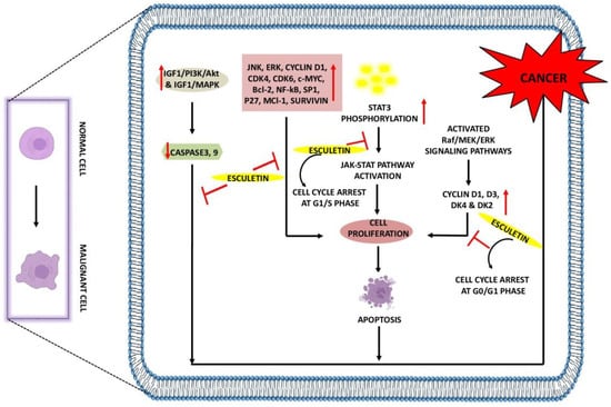Anti-cancer effects of esculetin: Esculetin downregulates the IGF1/PI3K/AKT, IGF1/MAPK, JNK, ERK, NF-κB, P27, Survivin, and Bcl-2. Esculetin also inhibits cell proliferation by inhibiting the STAT3 phosphorylation and cyclin D1, D3, DK4, and DK2, leading to apoptosis and suppression of cancer. ↑: Overexpression; ↓: low expression; ⊣: inhibition.