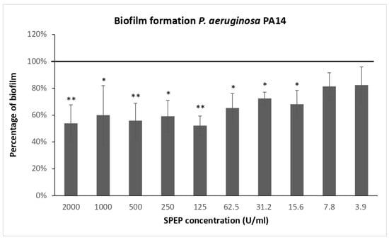 SPEP effect on P. aeruginosa PA14 biofilm formation starting from a concentration of 2000 U/mL. Results are expressed as the percentage of residual biofilm formation compared with an untreated sample. Data reported are representative of three independent experiments. Error bars indicate the standard deviations of three measurements. Statistical differences were determined by the Student’s t-test: * p < 0.05; ** p < 0.01, compared with the untreated samples.