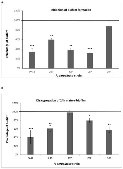 At lower concentrations, SPEP retains a partial antibiofilm activity. Based on these results, the adopted SPEP concentration for further experiments was 200 U/mL, because it assures about 50% biofilm disaggregation. Afterwards, SPEP activity was evaluated on clinical strains of P. aeruginosa. SPEP was added to the medium at the beginning of the cultivation (0 h, biofilm formation), or after 24 h of bacterial culture (24 h, mature biofilm). As a control, bacteria were cultured in BHI medium without SPEP. The effects of SPEP on biofilm formation are presented in Figure 2, Panel A. Results are expressed as a ratio between biofilm formed in presence of SPEP and biofilm produced by bacteria grown only in BHI medium.
