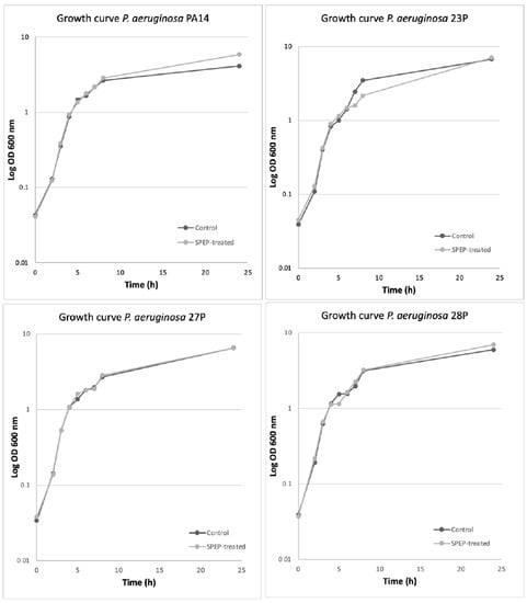 Furthermore, we evaluated the effects of SPEP on the growth curve of P. aeruginosa strains that were more influenced by its action. SPEP was added to the medium at the beginning of the growth and bacterial curves were monitored for over 30 h. As a control, bacteria were grown in the absence of SPEP. SPEP did not impair the P. aeruginosa duplication rate of tested strains as reported in Figure 3. Indeed, bacterial growth curves were approximately superimposable both in the presence or absence of SPEP.