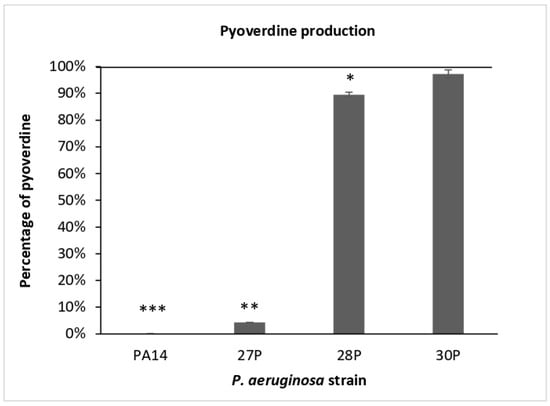 Lastly the effect of SPEP on the main siderophore, pyoverdine, of P. aeruginosa was evaluated. Pyoverdine production was spectrophotometrically evaluated at two different time points during the growth curve, at 24 and 48 h. Results obtained showed that it accumulated in the growth medium in four out of five strains only in the late stationary phase (48 h). Indeed, as reported in Table 2 (Section 4), pyoverdine was not produced in our experimental condition by strain 23P. Consequently, the effect of SPEP on pyoverdine production was only evaluated on strains PA14, 27P, 28P and 30P at 48 h of growth. Results are reported in Figure 5 (raw data are represented in Figure S4).