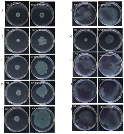 Motility assay (Petri plates diameter 8.5). Left Panel; Swarming assay of reference and clinical strains treated and not treated (NT) with SPEP. (A) P. aeruginosa PA14; (B) 23P; (C) 27P; (D) 28P; (E) 30P. Right Panel; Swimming assay of reference and clinical strains treated and not treated (NT) with SPEP. (F) P. aeruginosa PA14; (G) 23P; (H) 27P; (I) 28P; (J) 30P.