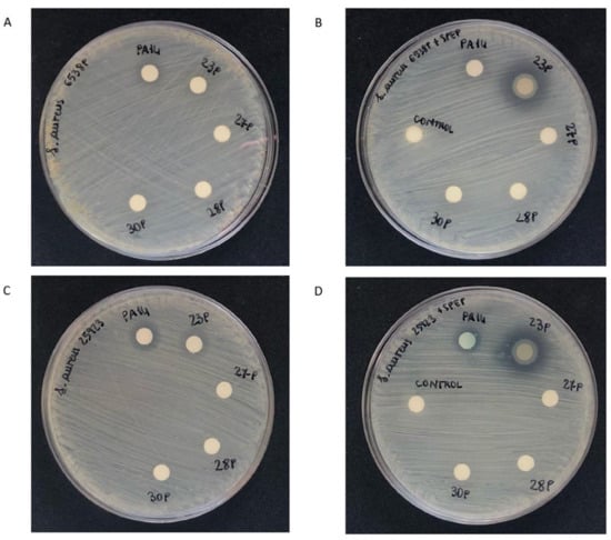 Disk diffusion susceptibility assay of S. aureus growth inhibition by the supernatant of P. aeruginosa treated and untreated with SPEP (Petri plates diameter 8.5). (A) Disk diffusion susceptibility assay of S. aureus 6538P containing supernatants derived from P. aeruginosa cultured in BHI. (B) Disk diffusion susceptibility assay of S. aureus 6538P containing supernatants obtained from P. aeruginosa cultured in BHI and 200 U/mL SPEP. (C) Disk diffusion susceptibility assay of S. aureus 25,923 containing supernatants derived from P. aeruginosa cultured in BHI. (D): Disk diffusion susceptibility assay of S. aureus 25,923 containing supernatants derived from P. aeruginosa cultured in BHI and 200 U/mL SPEP. Control disk contains 200 U/mL SPEP.