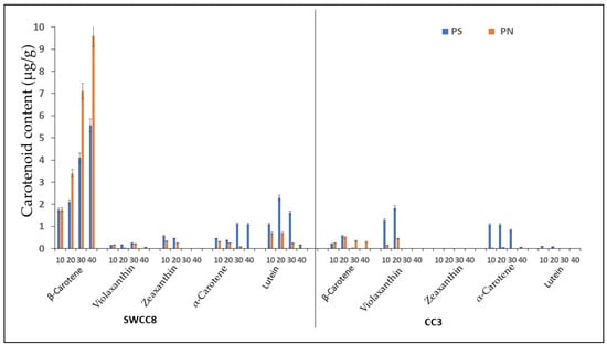 Carotenoid content (μg/g) and composition in the endocarp of WCC8 and CC3 under photoperiodic regimes. Data are means ± sd from analysis of carotenoid content in the endocarp of WCC8 and CC3 under two photoperiods. Vertical error bars represent the standard error of means (n = 3); 10, 20, 30, and 40 are days after pollination; PS—short day photoperiod; PN—Neutral day photoperiod.