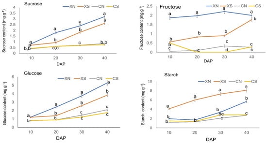 Carbohydrate profiles. The relative content of sucrose, fructose, glucose, and starch is influenced by photoperiod levels in the endocarp of the two cucumber varieties over time (DAP; days after pollination). Vertical bars represent the standard error of means (n = 3). Means with the same letters within each sampling day are not significantly different according to Tukey’s t-test (p ≤ 0.05). XN-SWCC8 under day neutral; XS—SWCC8 under a short day; CN—CC3 under day neutral; CS—CC3 under short day.