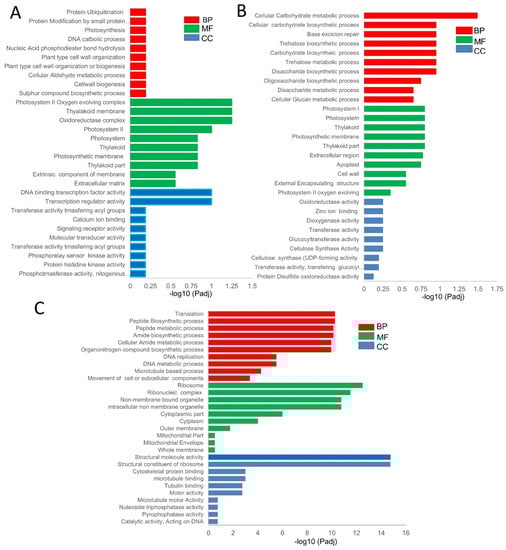 Gene ontology (GO) enrichment of differentially expressed genes in timepoint pairwise comparisons. (A) Shared GO in the pairwise comparisons between XS_vs_XN of 160 DEGs. (B) Common shared GO among timepoint pairwise comparisons of 30 DEGs within XN. (C) Common shared GO among timepoint pairwise comparisons of 1351 DEGs within XS. Red, green, and blue bars represent biological processes, molecular functions, and cellular components. The y-axis represents different GO terms and log10 (adj) in the x-axis.
