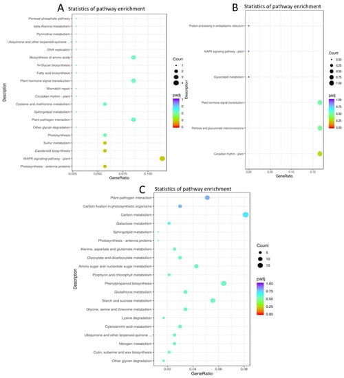 Significantly enriched KEGG pathways of DEGs in timepoint pairwise comparisons. (A) KEGG pathways of genes are commonly shared within timepoint pair-wise comparisons of XS_vs_XN. (B) KEGG pathways enriched in XN_vs_CN time point pairwise comparisons. (C) KEGG pathways enriched in XS_vs_CS pairwise comparisons.