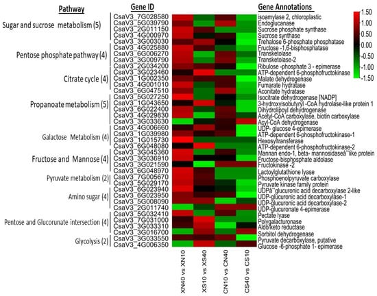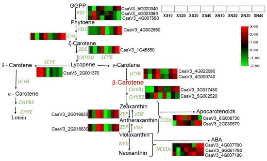 In this study, we observed a slight up-regulation of beta-carotene hydroxylase 1 (CHYβ1) (CsaV3_3G017450) at 40 DAP (FPKM = 1318.52) relative to XS at 40 DAPS (FPKM = 1129.618). This further emphasizes the putative role of CHYβ1 under day-neutral conditions. Under XS, the level of Zeaxanthin epoxidase (ZEP) increased firstly at XS_10DAP, dropped at 20 DAPS, and then increased again at XS_30 and 40 DAP, and its level was slightly higher in XS (FPKM = 152.300) at 40 DAP than in XN (FPKM = 145.965), but with no significant difference (p = 0.05). For CS and CN, the ZEP expression increased further under CN (229.84) than in CS (18.96) at 40 DAPS, but in the flesh, its expression decreased firstly and then increased at mature fruit stages (Datasheet S6). The level of carotenoid cleavage dioxygenase (CCD) had a high expression at XN_30 and 40 and a low FPKM value was observed under XS. CCD unigenes (CsaV3_6G008730) increased at XS_20 and XS 30, and then declined at XS_40, with a decreasing trend also shown in XN over time. CCD’s (CsV3.2G030870) highest peak expression was realized at 40 DAP in the flesh of CC3 (Figure S9 and Datasheet S6). Carotenoid biosynthetic genes were more highly expressed under XIS than CC3, with high expression levels observed under XN. Carotenoid degradation genes are expressed more highly in CC3 than in XIS with higher FPKM values in CN. The analysis of the top ten DEGs in CS and CN revealed high expressions of carotenoid cleavage-related genes such as WRKY protein, phenylalanine ammonolyses, glycosyltransferase, lipoxygenase, and peroxidase, among others (Table S2).