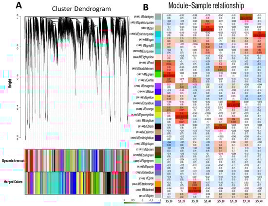 Establishment of WGCNA modules of the differentially expressed genes (DEGs) at the four stages of XIS (SWCC8)cucumber fruit development under short (XS) and day neutral (XN) photoperiod conditions. (A) Dendrogram of 21,742 DEGs obtained via hierarchical clustering of topological overlapping dissimilarity. (B) Relationships between module eigengenes (ME; rows) and sample at four stages (columns). The number in parenthesis against each eigengene is the number of DEGs. The color legend at the left corner underneath indicates the strength and direction of the correlation. Numbers within figure B are the partial Pearson correlations and the corresponding p-values. The upper value in each cell represents the correlation coefficient, and the lower value represents the p-value.