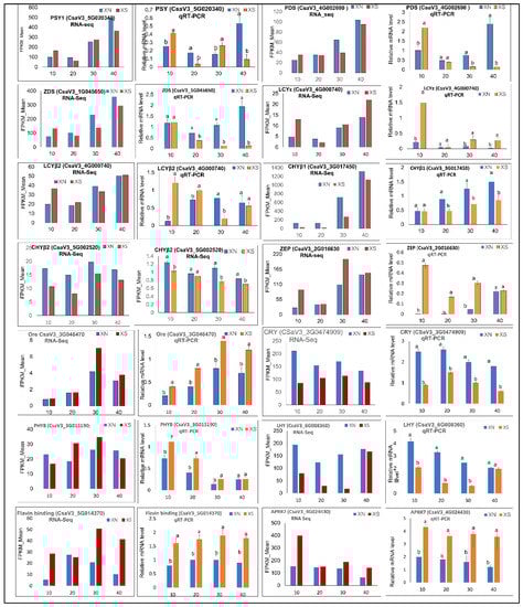 The phytochromes PHYA and PHYB have been identified as being primarily responsible for controlling photomorphogenesis and the synthesis of carotenoids [,,]. In our study, PHYB expression peaked at XS 20 and XS 30 before declining at XS 40, with expression generally being higher under XS than XN. PHYC was upregulated at XS_40 and XN_10. Phytochrome (PHY) and phytochrome-interacting factors’ (PIF) expression levels in the dark (short day) negatively regulate carotenoid structural genes (PSY2, PDS, ZDS, LCYE, and CHYB1). In agreement with our study, it has been reported that PHYA, PHYB, and PARI had high expression levels in underground, dark-grown carrot taproots with a reduction in their expression when exposed to light [].